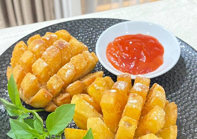 - Goreng kentang dengan posisi pola bunga menghadap ke atas, sesekali siram bagian atas kentang dengan minyak panas agar bentuknya semakin mekar, goreng hingga kentang berwarna keemasan dan renyah.