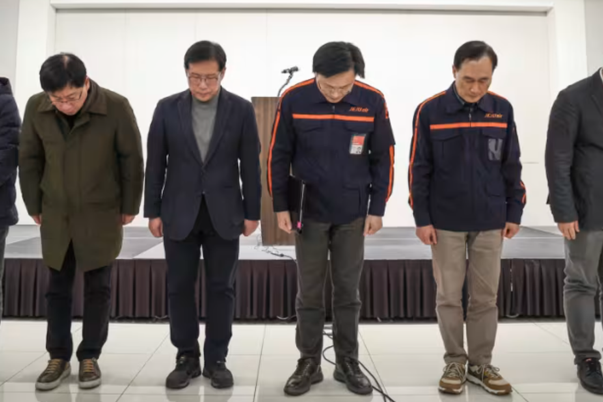 RAKYATSULBAR.COM – Chief Executive Officer (CEO) Jeju Air, Kim E-bae, bersama jajaran pejabat tinggi perusahaan, menyampaikan permintaan maaf secara terbuka atas kecelakaan pesawat Jeju Air di Bandara Internasional Muan, Minggu (29/12/2024).