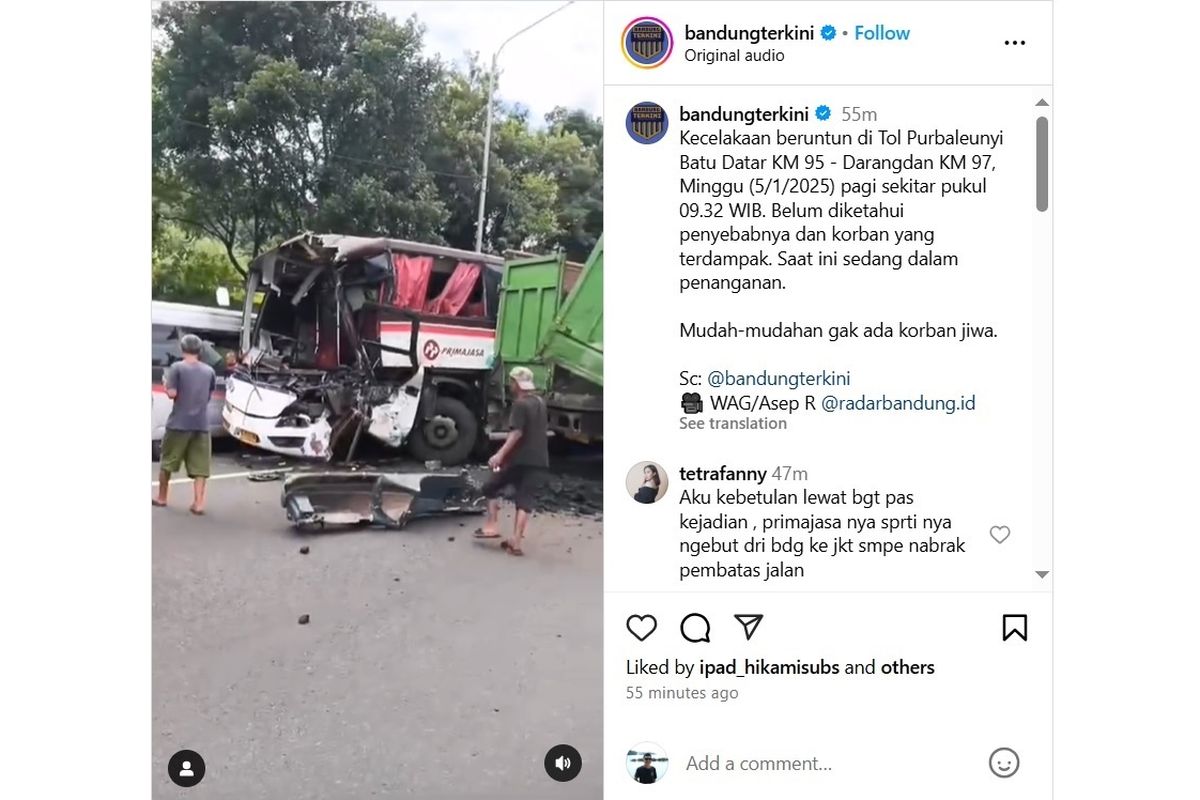Dilansir dari Instagram @bandungterkini, kecelakaan beruntun kabarnya terjadi di Tol Purbaleunyi Batu Datar KM 95 – Darangdan KM 97, Minggu (5/1/2025) pagi sekitar pukul 09.32 WIB.