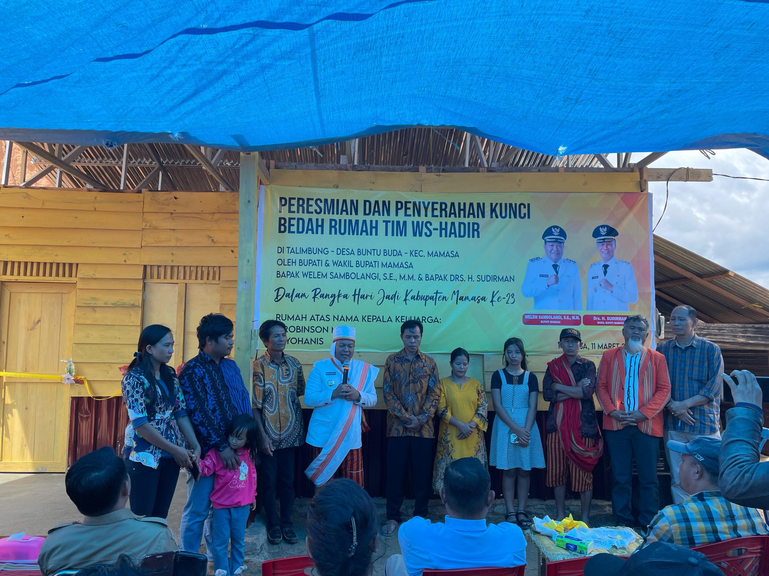 MAMASA, RAKYATSULBAR.COM — Bupati Mamasa Welem Sambolangi serahkan bantuan bedah rumah di kecamatan Mamasa, Desa Buntubuda.