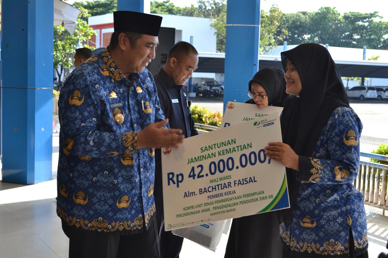 MAROS,RAKYATSULBAR.COM — Pemerintah Kabupaten Maros bersama dengan BPJS Ketenagakerjaan menyerahkan santunan jaminan kematian secara simbolis kepada ahli waris anggota Korps Pegawai Republik Indonesia (Korpri) di Lapangan Pallantikang, Kantor Bupati Maros, Kamis (17/4/25).