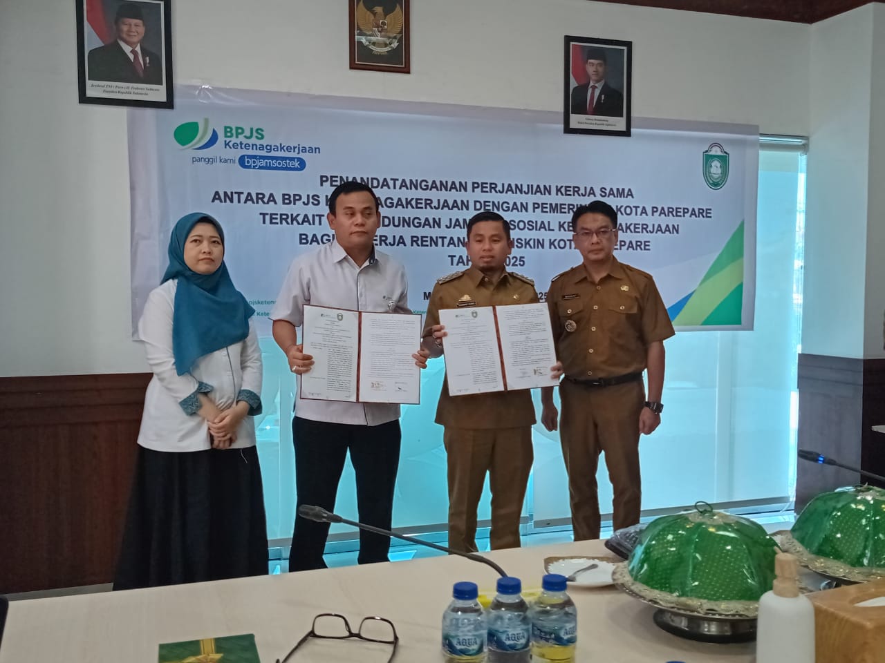MAKASSAR, RAKYATSULBAR.COM — BPJS Ketenagakerjaan bersama Pemerintah Kota Parepare menggelar penandatanganan perjanjian kerjasama terkait perlindungan jaminan sosial ketenagakerjaan bagi pekerja rentan dan miskin di Kantor BPJS Ketenagakerjaan jl Urip Sumoharjo, Senin (28/4/25).