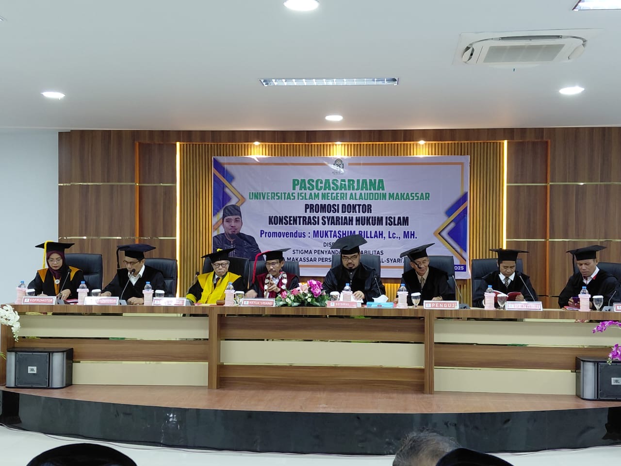 MAKASSAR,RAKYATSULBAR.COM—Muktashim Billah resmi menyandang gelar doktor usai mempertahankan disertasinya dalam sidang promosi doktor di Program Studi Dirasah Islamiyah, Pascasarjana Universitas Islam Negeri (UIN) Alauddin Makassar, Senin, 19 Mei 2025.
