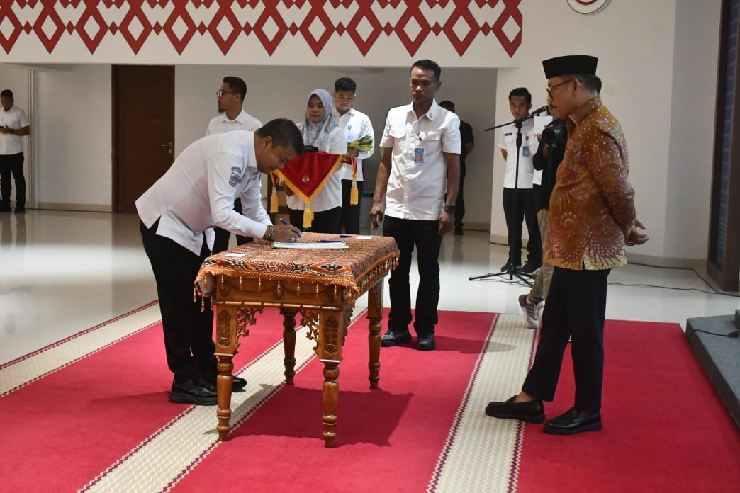 MAMUJU, RAKYATSULBAR.COM –– Para Pimpinan Organisasi Perangkat Daerah (OPD) Lingkup Pemprov Sulbar melakukan Penandatanganan Pakta Integritas dan Perjanjian Kinerja Pejabat Pimpinan Tinggi Pratama dihadapan langsung Gubernur Sulbar, Suhardi Duka, berlangsung di Ballroom Andi Depu Lantai 3 Kantor Gubernur Sulbar, Rabu (16/7/25).