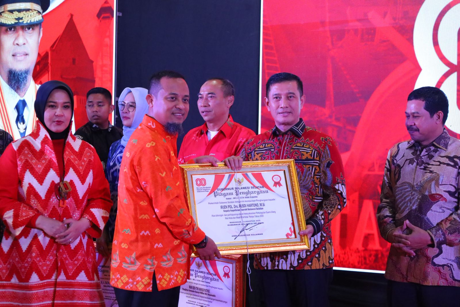 MAKASSAR, RAKYATSULBAR.COM –– Kapolda Sulawesi Selatan, Irjen Pol. Drs. Rusdi Hartono, menerima penghargaan dari Gubernur Sulawesi Selatan, Andi Sudirman Sulaiman, pada acara Ramah Tamah Peringatan HUT Ke-80 Kemerdekaan Republik Indonesia Tahun 2025.