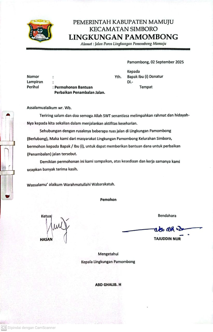 Diketahui, saat ini panitia penggalangan dana perbaikan Jalan Lingkungan Pamombong sudah terbentuk. Dana yang terkumpul akan disimpan di bendahara panitia.
