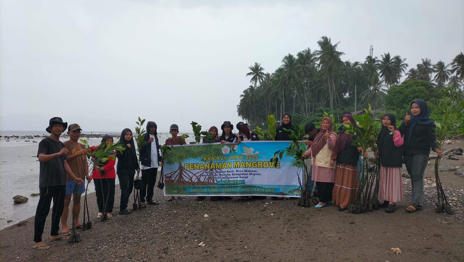 MAJENE, RAKYATSULBAR.COM –Mahasiswa KKN Angkatan XVII Unika Mamuju Bersama dengan Pemerintah dan warga desa Maliaya, Kecamatan Malunda, Kabupaten Majene, Sulbar, melaksanakan Penanaman Bibit Bakau di Pantai desa Maliaya, Minggu (14/9/25)