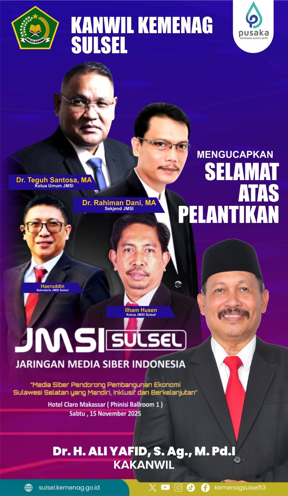 MAKASSAR, RAKYATSULBAR.COM- Kepala Kantor Wilayah Kementerian Agama Provinsi Sulawesi Selatan (Kakanwil Kemenag Sulsel), Dr. H. Ali Yafid, menyampaikan ucapan selamat atas pelantikan Ilham Husen sebagai Ketua JMSI Sulsel, dan Haeruddin sebagai Sekretaris JMSI Sulsel yang akan digelar di Hotel Claro Makassar, Sabtu (15/11/25).