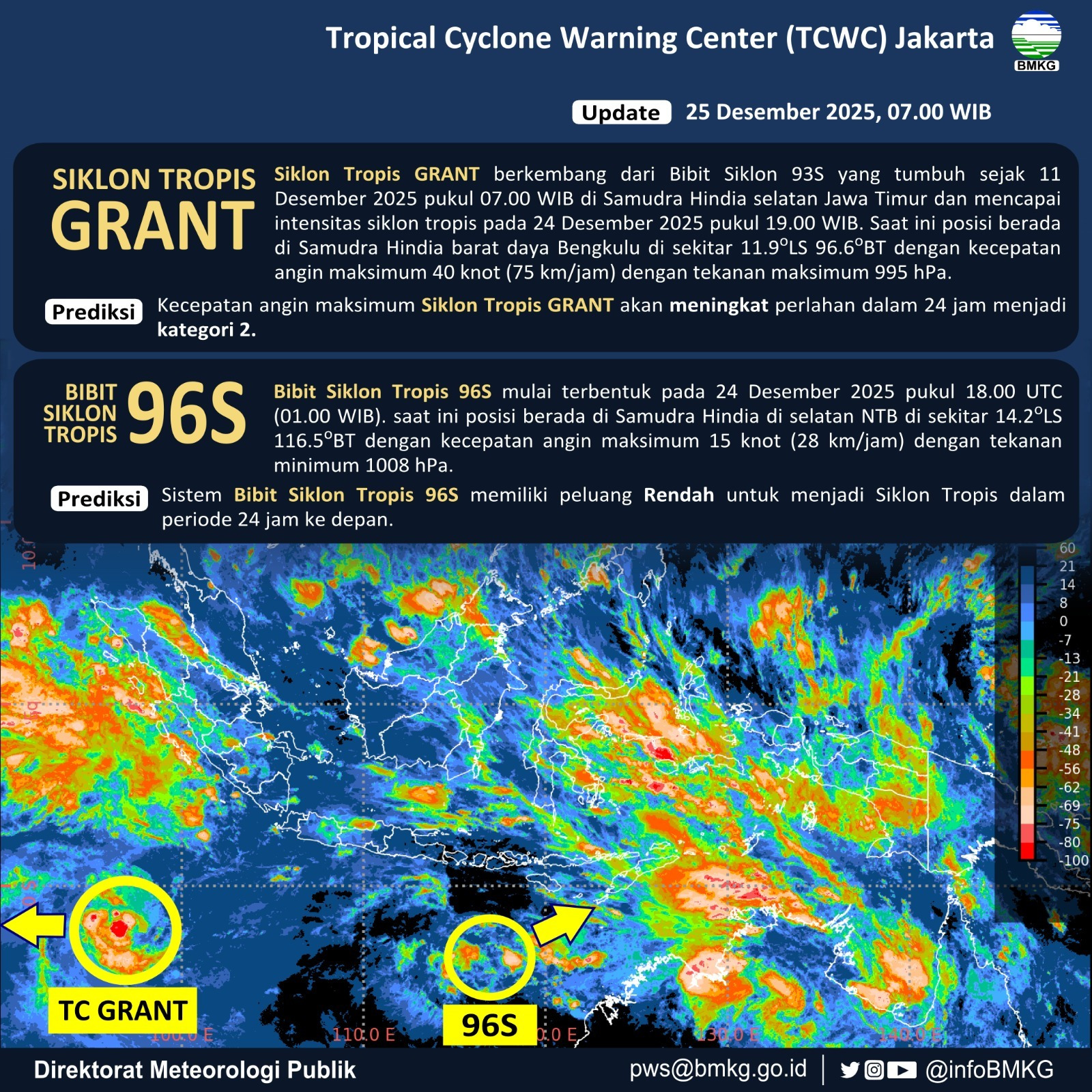 Dalam laporan yang diterima pada Kamis 25 Desember 2025 tersebut, disampaikan bahwa Siklon Tropis Grant berkembang dari bibit siklon 93S yang mulai tumbuh sejak 11 Desember 2025 pukul 07.00 WIB di wilayah Samudra Hindia selatan Jawa Timur, dan mencapai intensitas siklon tropis pada 24 Desember 2025 pukul 19.00 WIB.