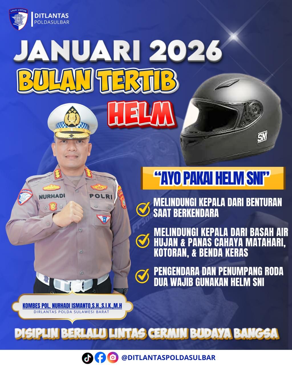 Melalui kampanye visual yang menghadirkan Direktur Lalu Lintas Polda Sulbar Kombes Pol. Nurhadi Ismanto, pesan kuat “Ayo Pakai Helm SNI” digaungkan secara luas.