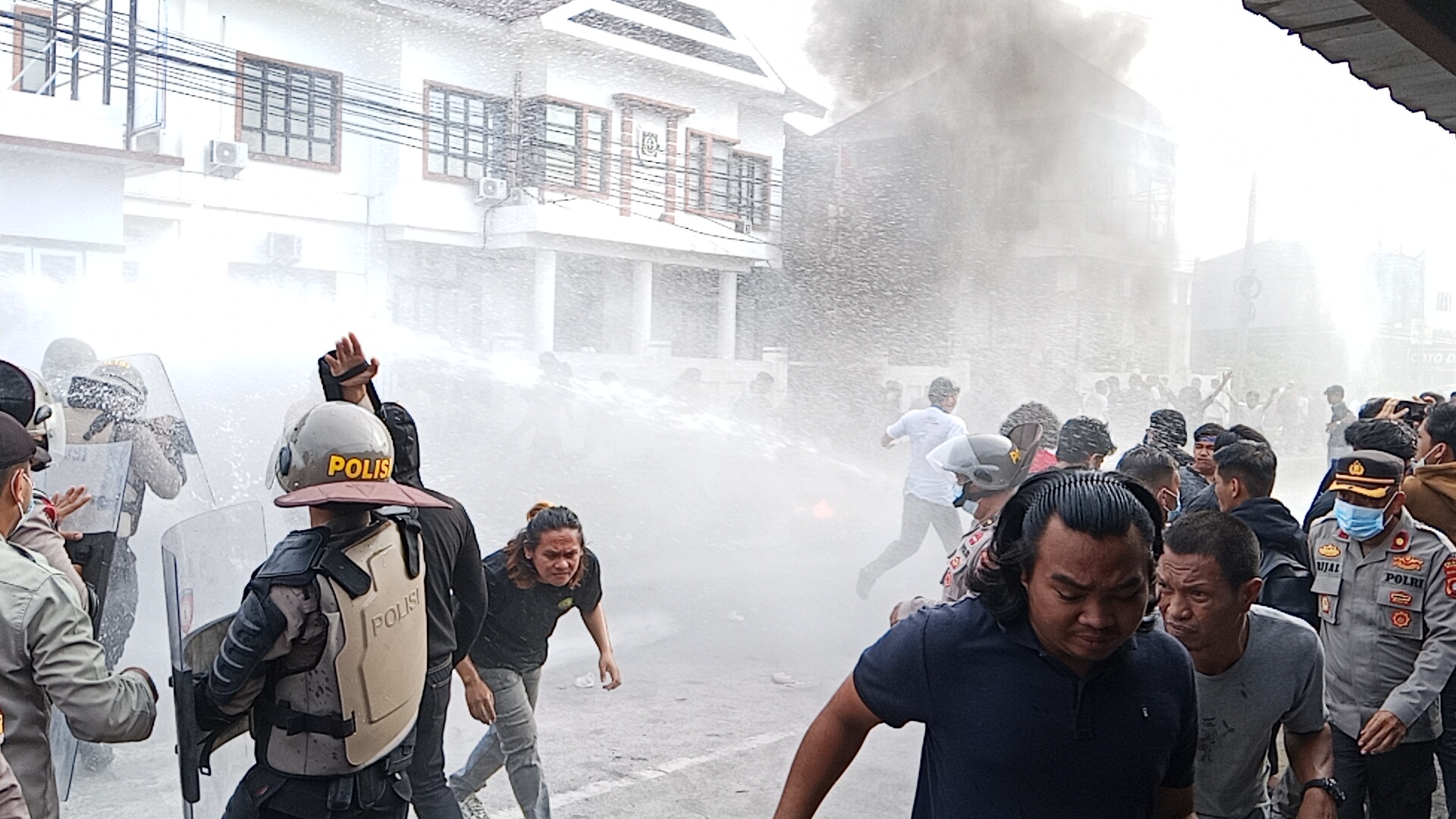 Situasi semakin memanas ketika aparat keamanan melakukan penyemprotan water canon ke arah massa aksi. Upaya pembubaran kemudian dilanjutkan dengan tembakan gas air mata. Tidak terima dengan tindakan tersebut, massa aksi membalas dengan lemparan batu ke arah aparat kepolisian.