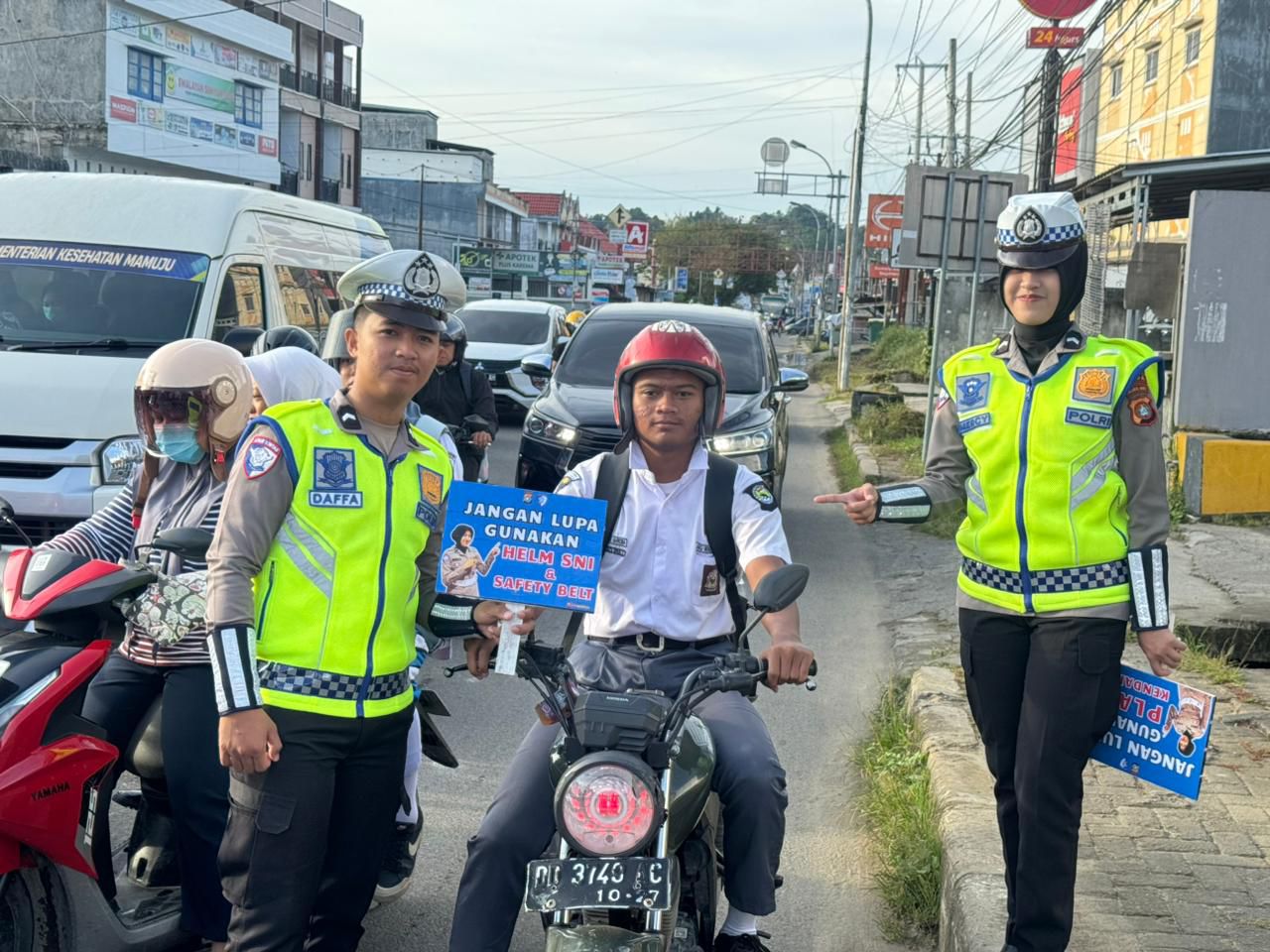 Dalam kesempatan ini, personel tidak hanya memberikan himbauan secara langsung kepada seluruh pengguna jalan yang melintas di lokasi tersebut, tetapi juga melakukan serangkaian tindakan edukatif.