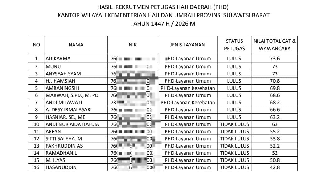 MAMUJU, RAKYATSULBAR.COM — Panitia Seleksi Pendamping Haji Daerah (PHD) Provinsi Sulawesi Barat Tahun 2026 resmi menetapkan hasil akhir seleksi. Dari total peserta yang mengikuti seluruh tahapan seleksi, sembilan orang dinyatakan lulus, sementara tujuh peserta lainnya tidak lolos.