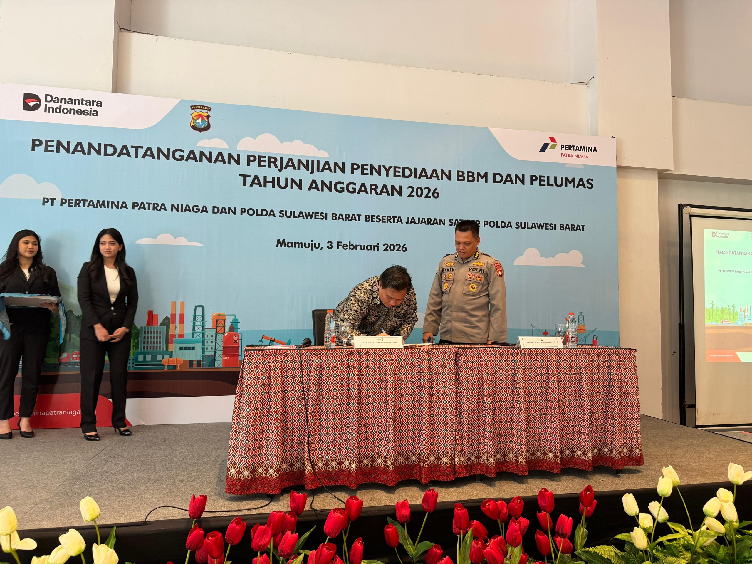 MAMUJU, RAKYATSULBAR.COM –– Sinergi antara kepolisian dan badan usaha milik negara semakin diperkuat! Polda Sulawesi Barat bersama PT Pertamina Patra Niaga resmi menandatangani Perjanjian Penyediaan Bahan Bakar Minyak (BBM) Tahun Anggaran 2026, Selasa (3/2/26) di Ballroom Hotel Maleo, Mamuju.