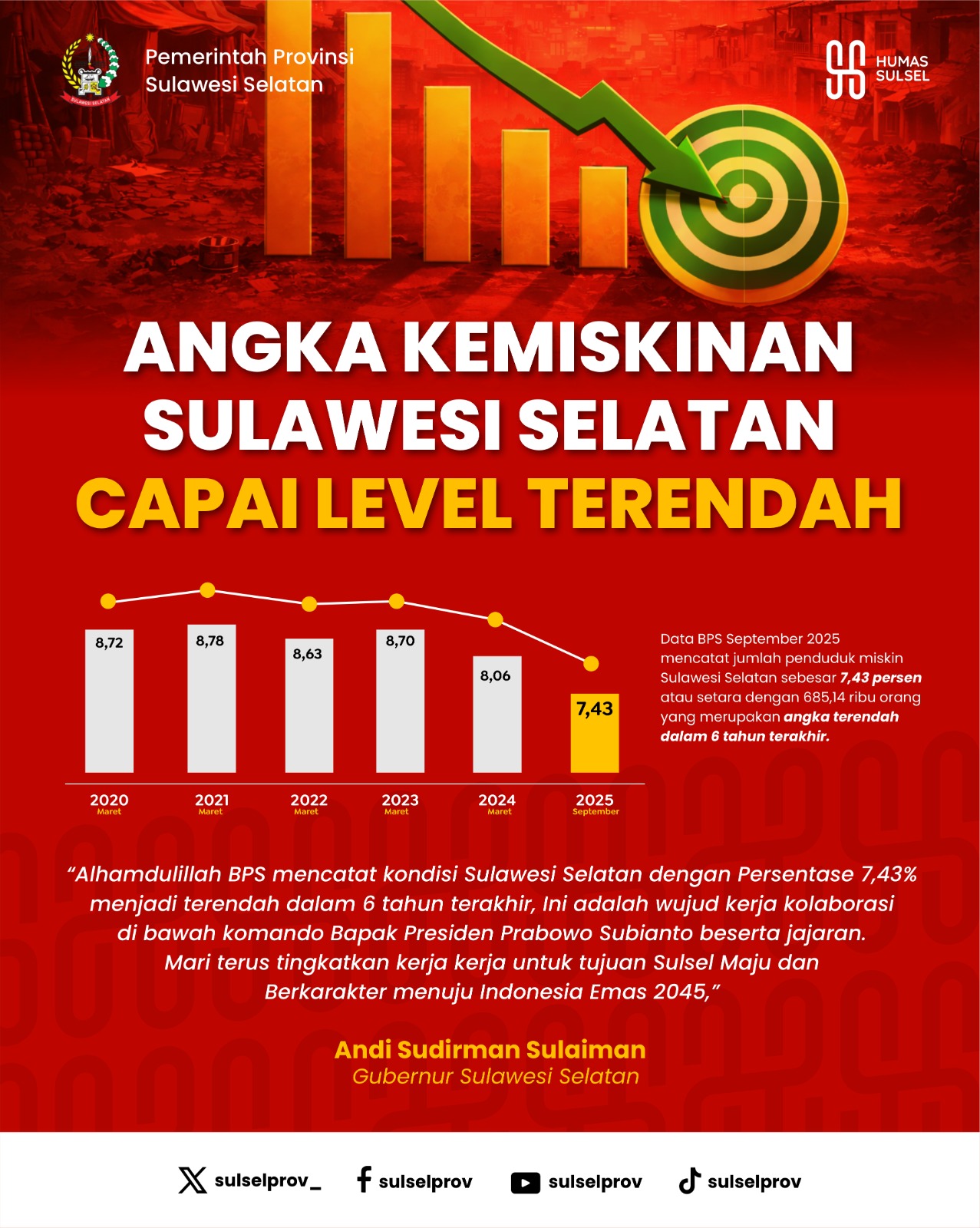 “Alhamdulillah BPS mencatat kondisi Sulawesi Selatan dengan Persentase 7,43% menjadi terendah dalam 6 tahun terakhir,” kata Andi Sudirman, Jumat (6/2/2026).
