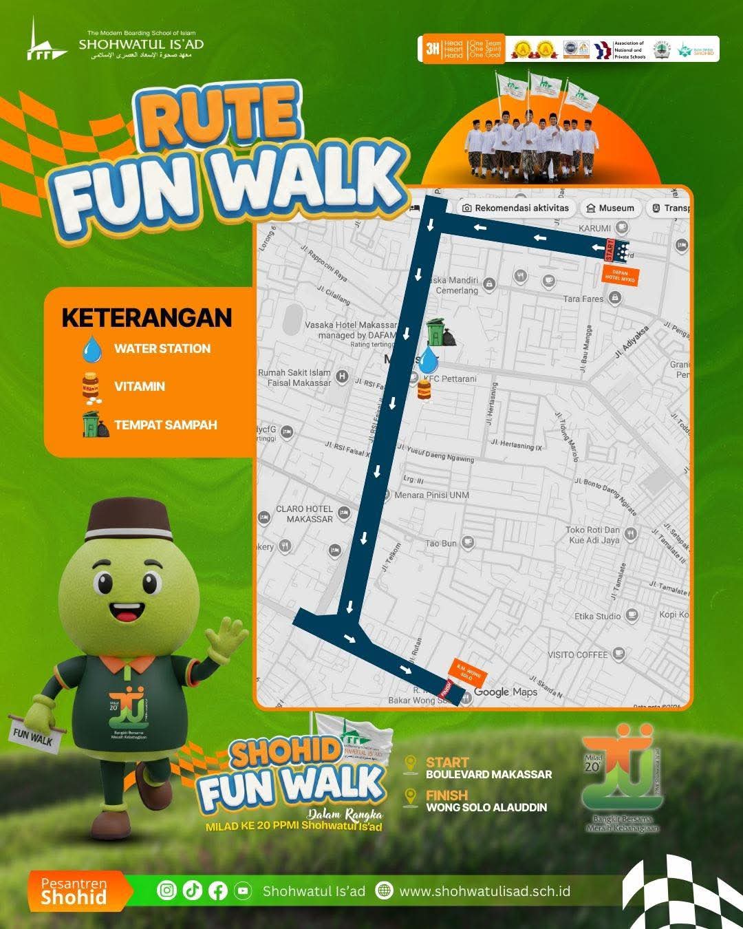 “Ayo, ramaikan Shohid Fun Walk sebagai wujud syukur, kebersamaan, dan semangat sehat bersama. Mari melangkah santai menyusuri rute yang telah disiapkan untuk mempererat silaturahmi seluruh civitas, alumni, orang tua, dan keluarga besar PPMI Shohwatul Is’ad. Ayo hadir dan jadi bagian dari sejarah 20 tahun perjalanan kami,” ujar Ustadz Muhammad Mukhlis Halide.