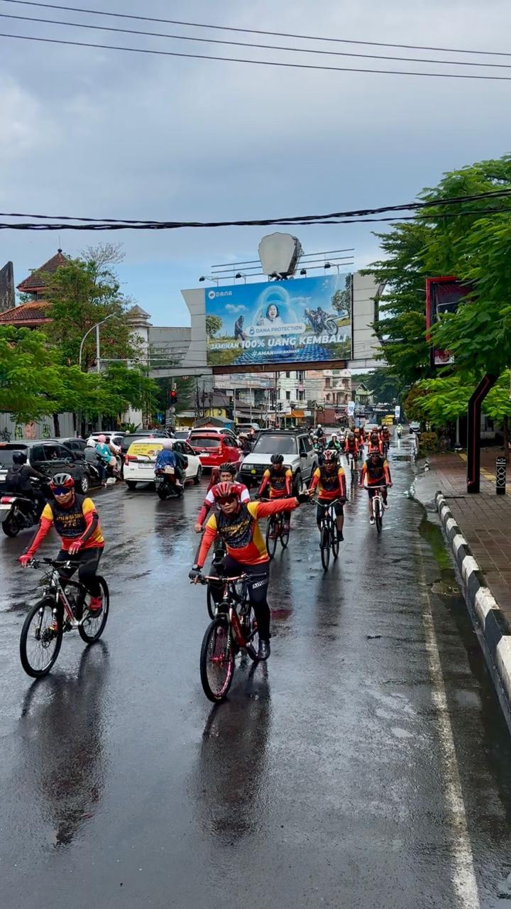 Di bawah rintik hujan, rombongan yang dipimpin Kabag Ops Sat Brimob Polda Sulsel, AKBP Nur Ichsan, S.Sos., M.Si tidak menghalangi personel SCC mengayuh sepeda, di Ahad pagi.