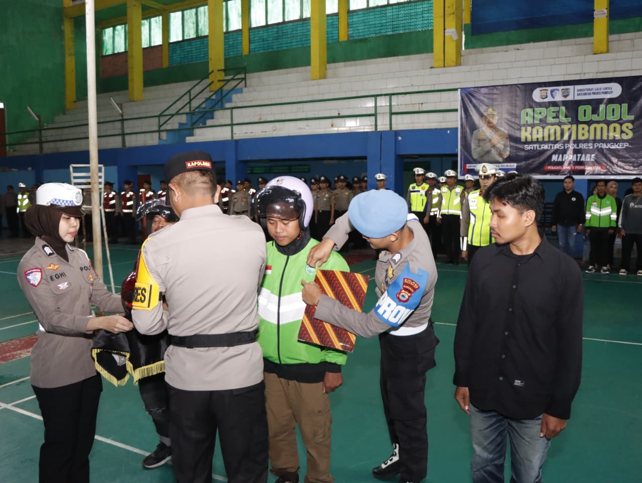 Dalam momentum tersebut, Kapolres Pangkep menyematkan pin Polantas Mappatabe dan memasangkan helm kepada perwakilan pengemudi ojol sebagai simbol komitmen bersama terhadap keselamatan berlalu lintas.