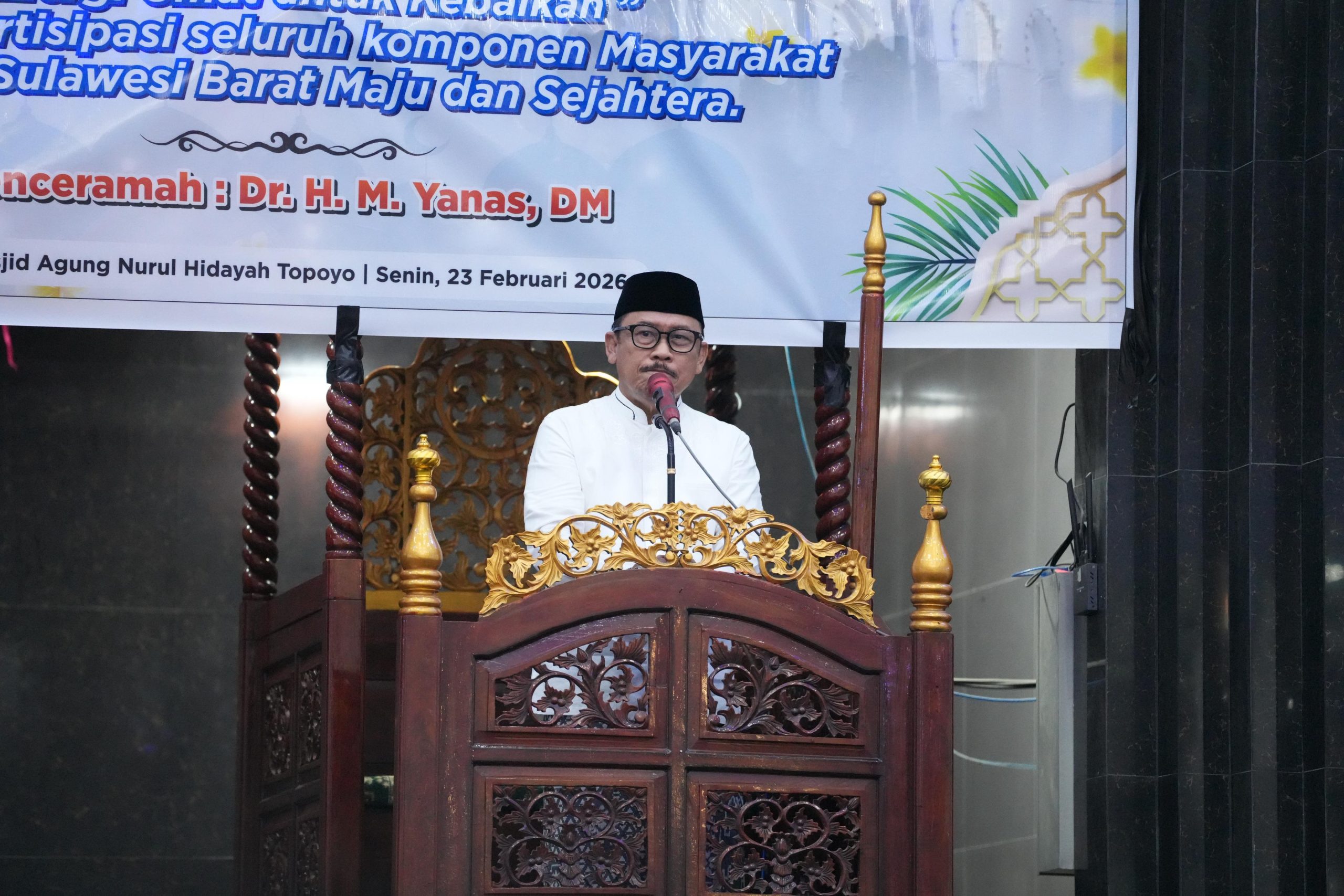MATENG, RAKYATSULBAR.COM — Gubernur Sulawesi Barat, Suhardi Duka, melaksanakan Safari Ramadan 1447 Hijriah di Masjid Nurul Hidayah Topoyo, Kabupaten Mamuju Tengah, Senin malam (23/2/26).