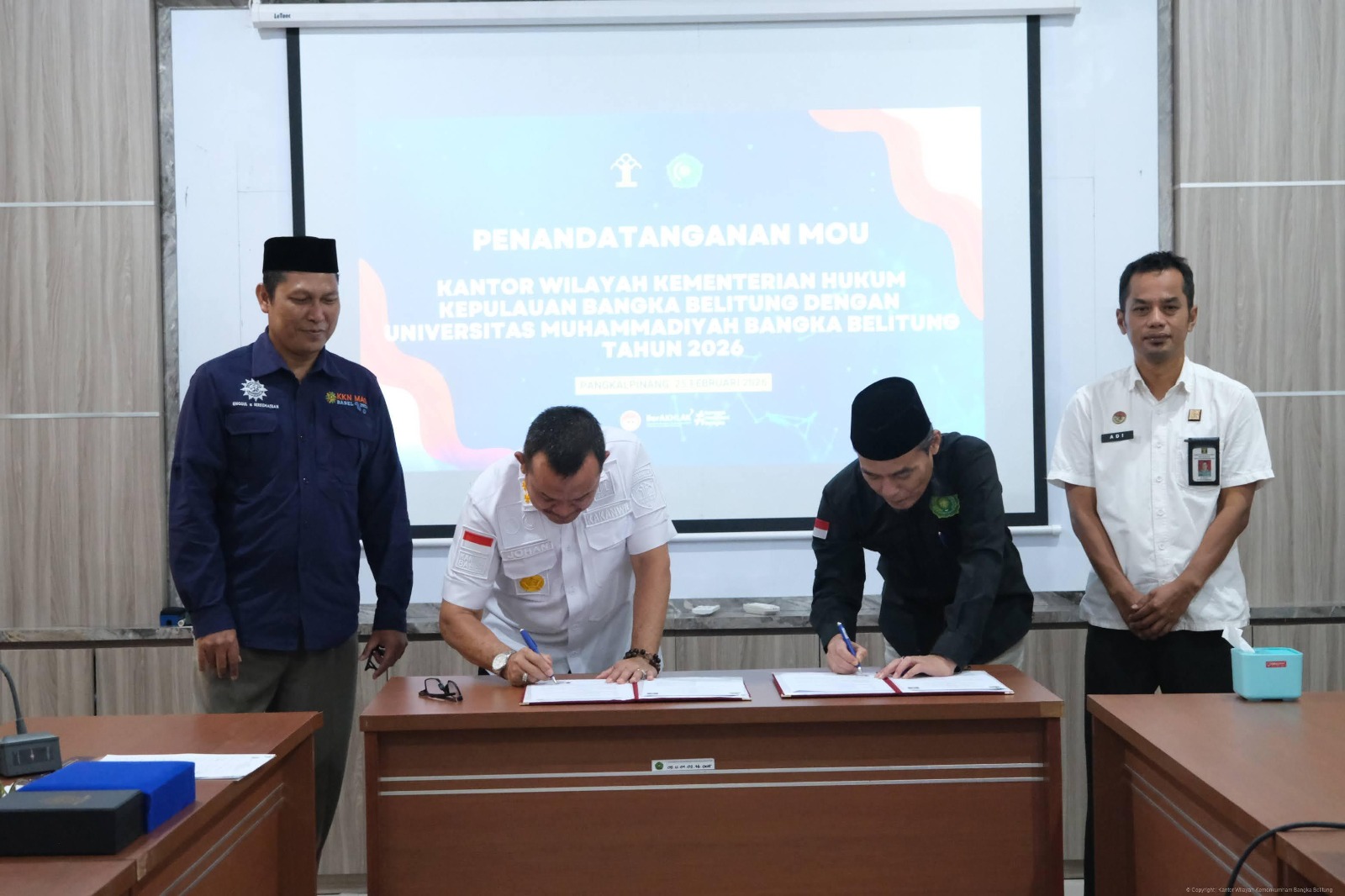 Penandatanganan dilakukan oleh Kepala Kantor Wilayah Kemenkum Babel, Johan Manurung, bersama Rektor Universitas Muhammadiyah Bangka Belitung, Fadillah Sabri, serta disaksikan jajaran pimpinan universitas dan Bidang Kekayaan Intelektual Kanwil Kemenkum Babel. Kerja sama ini difokuskan pada penguatan pelaksanaan Tri Dharma Perguruan Tinggi, pendidikan, penelitian, dan pengabdian kepada masyarakat serta optimalisasi perlindungan dan pemanfaatan Kekayaan Intelektual (KI) atas hasil riset dan inovasi sivitas akademika.