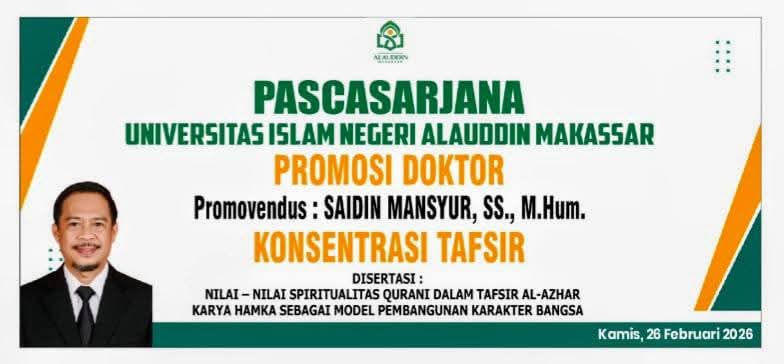 MAKASSAR, RAKYATSULBAR.COM – Program Pascasarjana Universitas Islam Negeri (UIN) Alauddin Makassar kembali mencetak doktor baru. Saidin Mansyur resmi menyandang gelar doktor pada Program Studi Dirasah Islamiyah konsentrasi Tafsir usai mempertahankan disertasinya dalam ujian promosi doktor yang digelar di kampus tersebut, Jumat (27/2/2026).