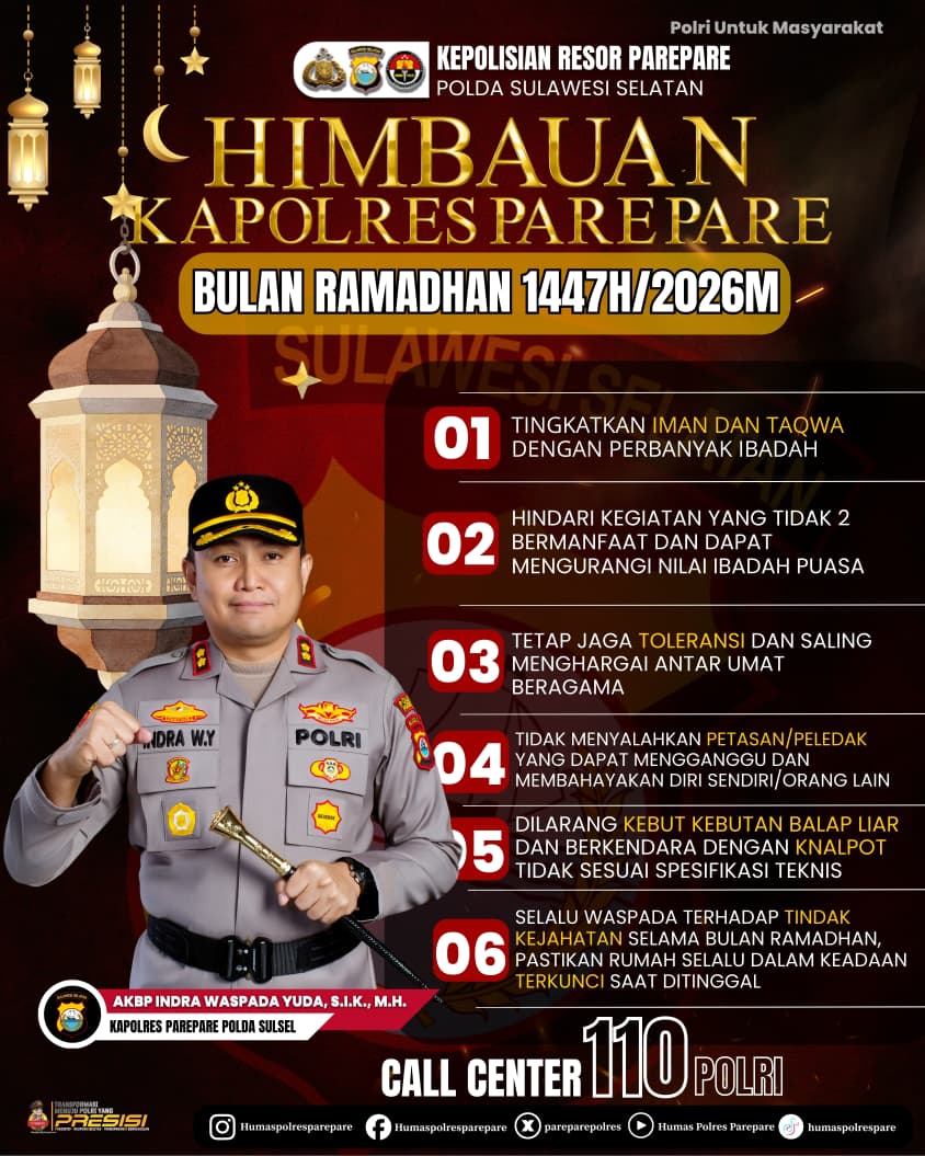 Dalam pesan imbauan tersebut, Kapolres mengajak masyarakat, khususnya umat Muslim di Kota Parepare, untuk memanfaatkan momentum Ramadan dengan memperbanyak ibadah dan kegiatan positif.