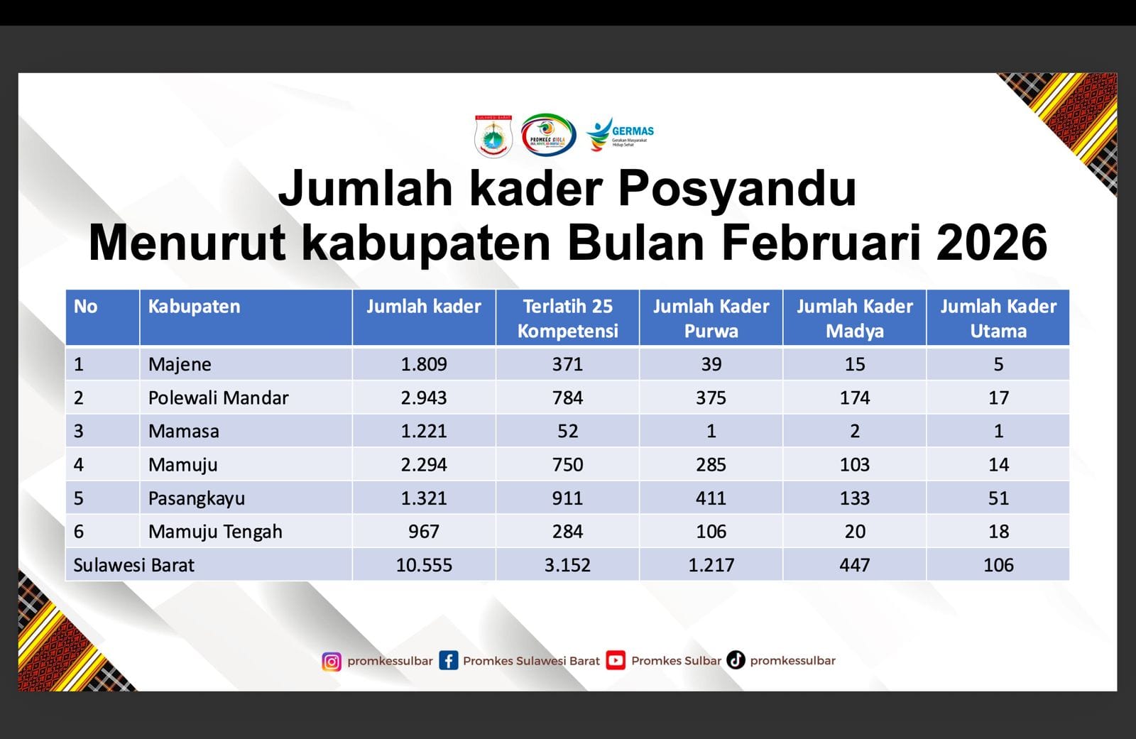 Data Dinas Kesehatan, Pengendalian Penduduk dan Keluarga Berencana (DKPPKB) Provinsi Sulawesi Barat per Februari 2026 menunjukkan bahwa jumlah kader Posyandu yang tersebar di enam kabupaten di Sulawesi Barat mencapai 10.555 orang.
