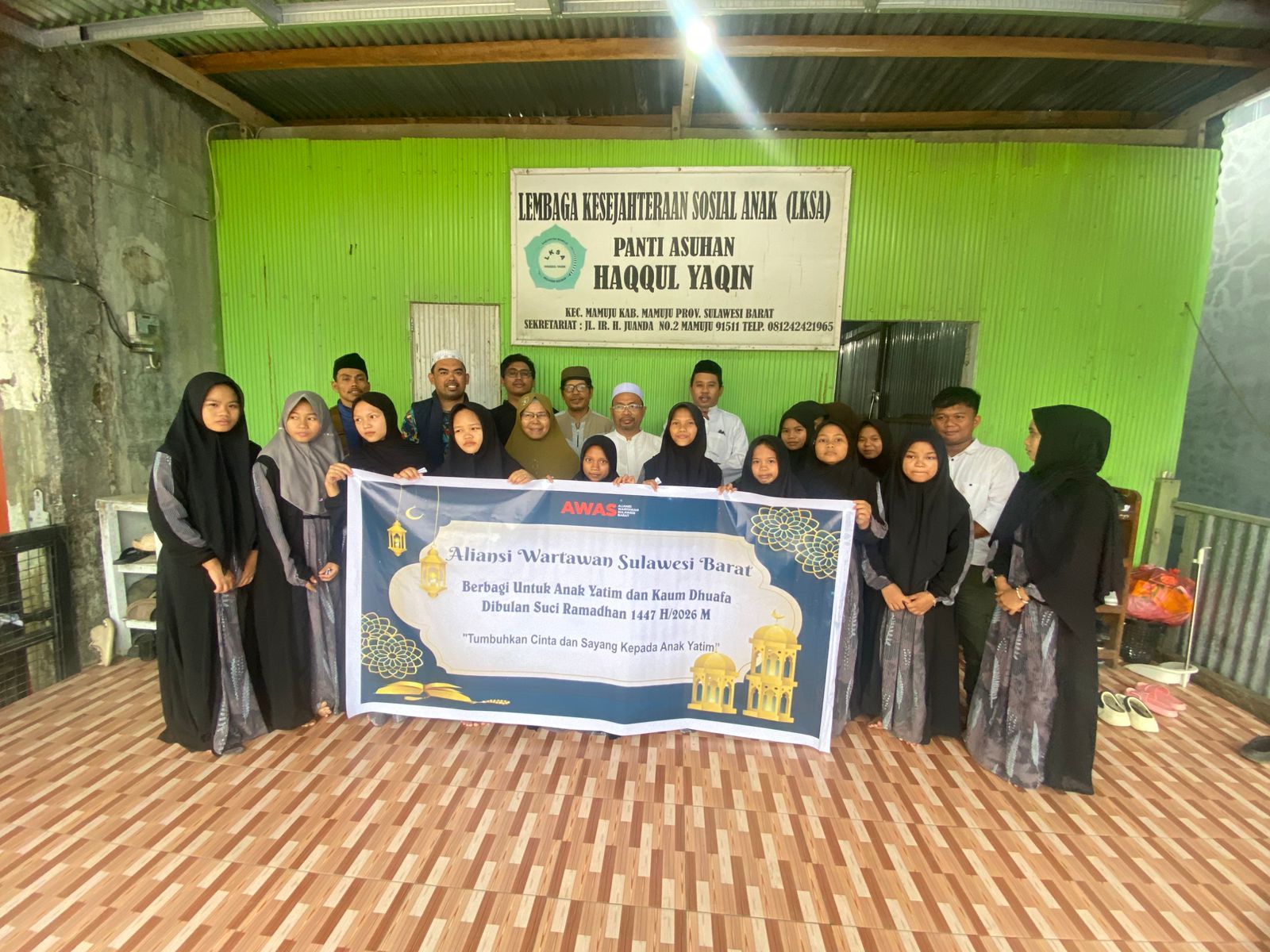 MAMUJU, RAKYATSULBAR.COM — Aliansi Wartawan Sulawesi Barat (AWAS) berbagi berkah di bulan suci Ramadan 1447 H dengan mengunjungi Panti Asuhan Haqqul Yaqin yang terletak di Simpang Lima, Mamuju, Minggu (15/3/26).
