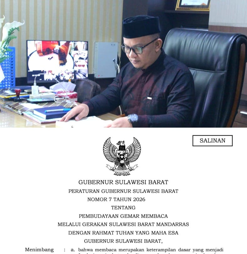 MAMUJU , RAKYATSULBAR.COM – Pemerintah Provinsi Sulawesi Barat (Pemprov Sulbar) resmi menetapkan Peraturan Gubernur Sulawesi Barat Nomor 7 Tahun 2026 tentang Pembudayaan Gemar Membaca melalui Gerakan Sulawesi Barat Mandarras sebagai langkah strategis dalam meningkatkan kualitas sumber daya manusia dan memperkuat budaya literasi di daerah. Peraturan ini ditetapkan oleh Gubernur Sulbar Suhardi Duka (SDK) pada 10 Maret 2026 di Mamuju.