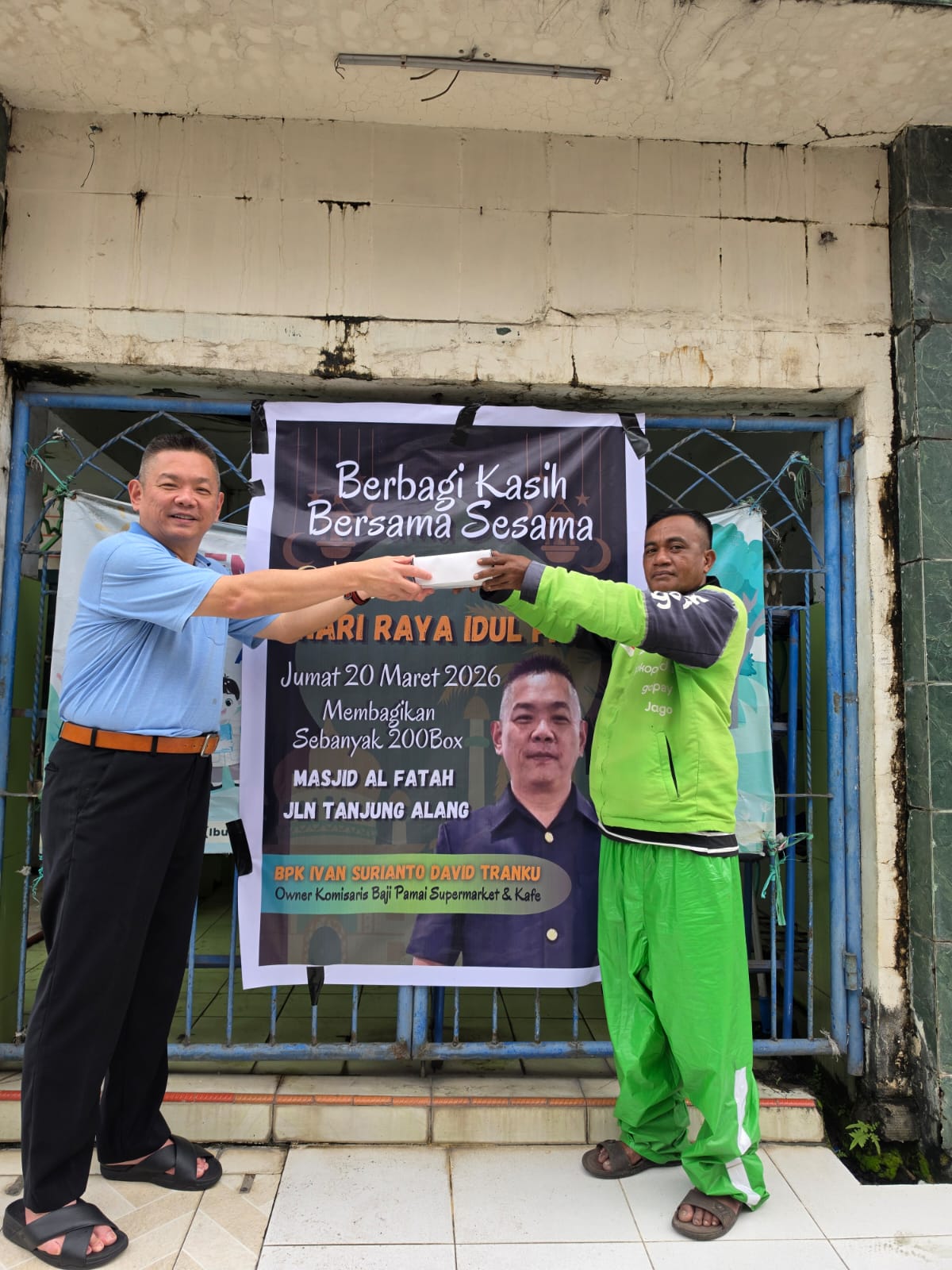 Owner Baji Pamai Supermarket dan Kafe, Ivan Surianto David Tranku, menggelar aksi kemanusiaan dengan membagikan 200 paket nasi dos kepada jemaah dan warga di Masjid Al Anshar, Jumat (20/3/2026).