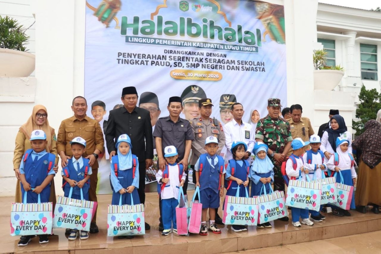 LUWU TIMUR, RAKYATSULBAR.COM- Bupati Luwu Timur Irwan Bachri Syam menyerahkan bantuan seragam sekolah untuk 16.253 siswa PAUD hingga SMP, termasuk sekolah swasta, di halaman Kantor Bupati saat apel pagi pertama pasca-libur sekolah dan kerja, Senin (30/3/2026).