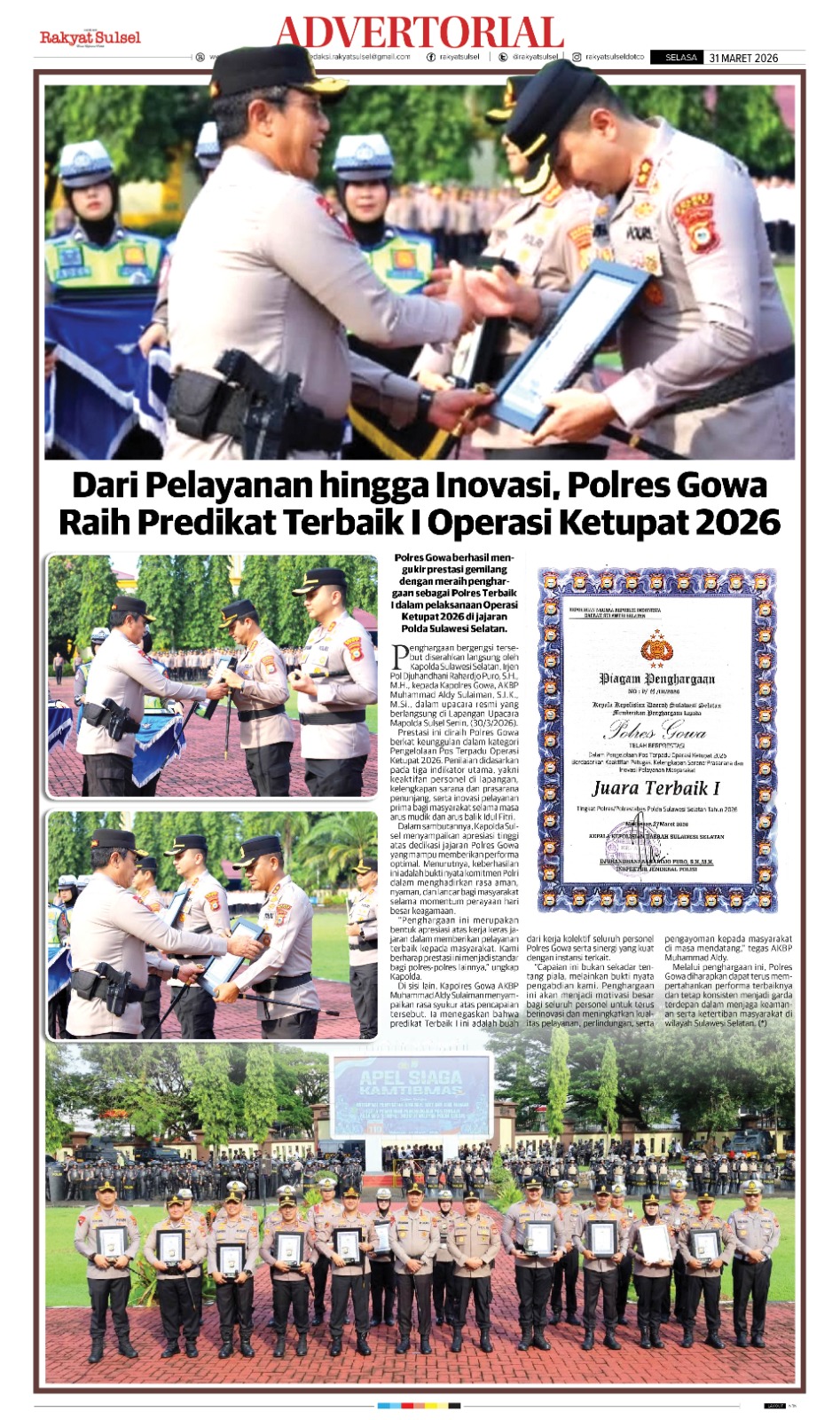 MAKASSAR, RAKYATSULBAR.COM – Polres Gowa berhasil mengukir prestasi gemilang dengan meraih penghargaan sebagai Polres Terbaik I dalam pelaksanaan Operasi Ketupat 2026 di jajaran Polda Sulawesi Selatan.
