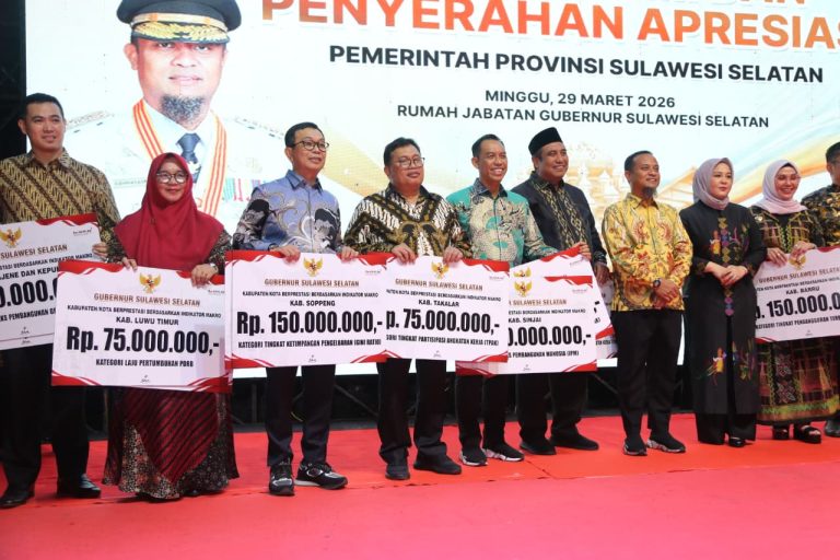 MAKASSAR, RAKYATSULBAR.COM – Pemerintah Kabupaten Luwu Timur kembali menorehkan prestasi membanggakan di tingkat provinsi. Dalam acara Silaturahmi dan Penyerahan Apresiasi Pemerintah Provinsi Sulawesi Selatan yang digelar di Rumah Jabatan Gubernur Sulsel, Makassar, Ahad (29/3/2026), Luwu Timur sukses menyabet tiga penghargaan sekaligus atas capaian kinerja pembangunan daerah.