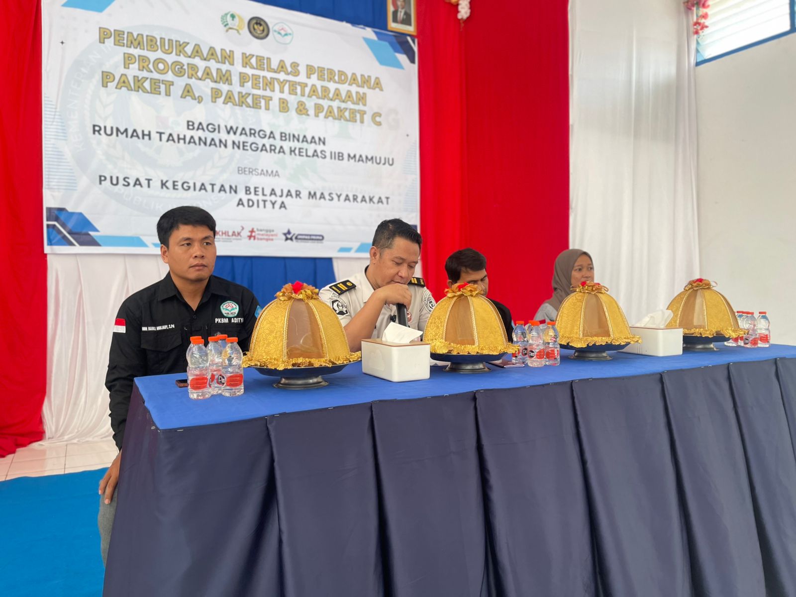 MAMUJU, RAKYATSULBAR.COM — Sebagai bentuk komitmen dalam mendukung peningkatan kualitas sumber daya manusia Warga Binaan, Rumah Tahanan Negara Kelas IIB Mamuju bekerja sama dengan Pusat Kegiatan Belajar Masyarakat (PKBM) Aditya resmi membuka kelas perdana program pendidikan penyetaraan bagi Warga Binaan, bertempat di Aula Rutama, Selasa (7/4/26).