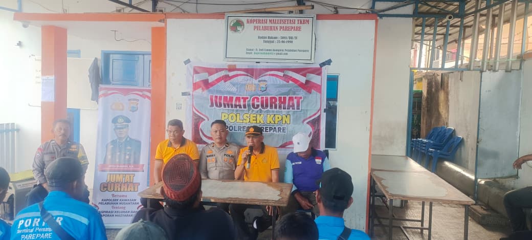 PAREPARE, RAKYATSULBAR.COM — Kepolisian Sektor Kawasan Pelabuhan Nusantara (KPN) Parepare kembali menggelar program “Jumat Curhat” sebagai wadah menyerap aspirasi masyarakat. Kali ini, kegiatan berlangsung bersama Tenaga Kerja Bongkar Muat (TKBM) di Kantor Koperasi TKBM Pelabuhan Nusantara Parepare, Jalan Andi Cammi, Kelurahan Mallusetasi, Kecamatan Ujung, Jumat (10/4/2026) pagi.