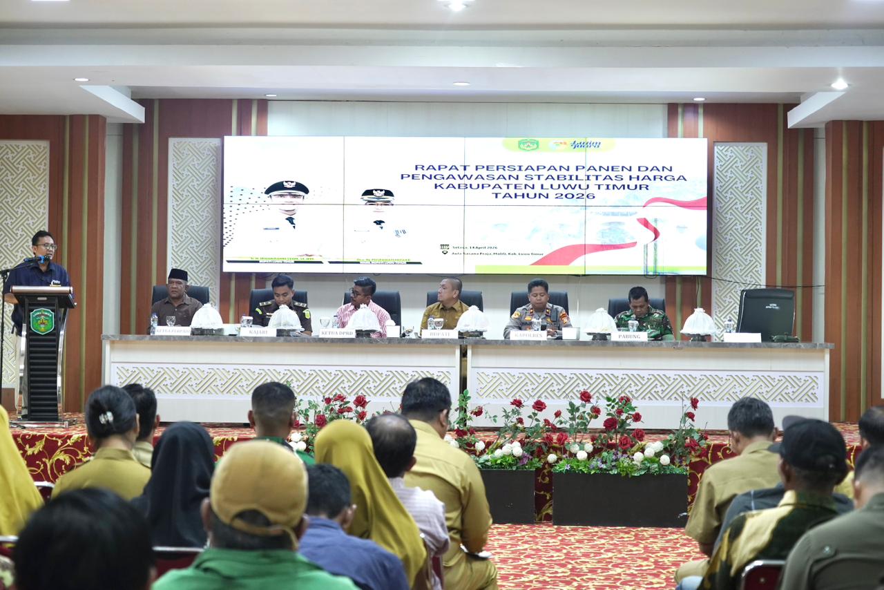 Rapat yang berlangsung di Aula Sasana Praja, Kantor Bupati Luwu Timur, Selasa (14/04/2026), dihadiri unsur Forkopimda Luwu Timur, Pimpinan Perum Bulog Kantor Cabang Palopo, Staf Ahli, OPD terkait, para camat, pengurus dan anggota Perpadi, koordinator BPP, serta ketua Gapoktan dan pengurus kelompok tani se-Kabupaten Luwu Timur.