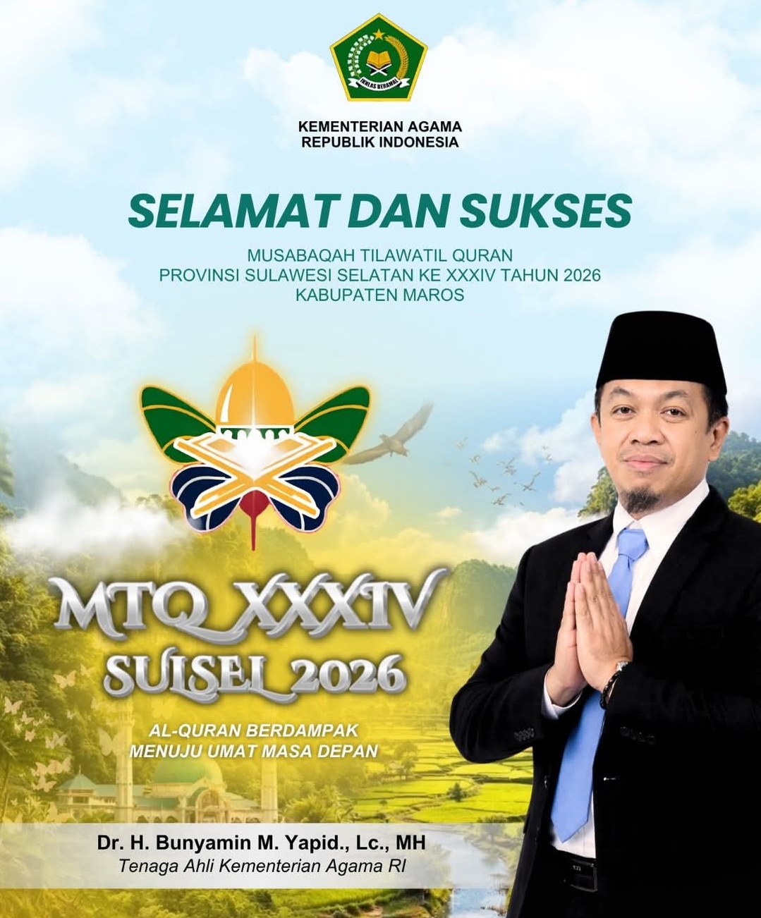 MAROS, RAKYATSULBAR.COM – Penyelenggaraan Musabaqah Tilawatil Quran (MTQ) Tingkat Provinsi Sulawesi Selatan ke-XXXIV Tahun 2026 yang dipusatkan di Kabupaten Maros mendapat apresiasi tinggi dari tingkat pusat. Tenaga Ahli Kementerian Agama Republik Indonesia, Dr. H. Bunyamin M. Yapid, Lc., MH., memberikan pujian khusus atas suksesnya perhelatan religius tersebut.