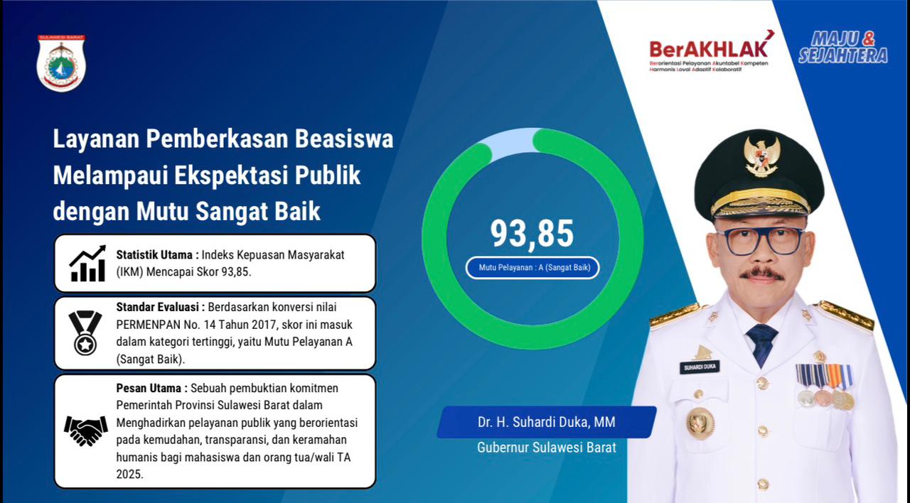Berdasarkan dokumen evaluasi terbaru, layanan pemberkasan beasiswa Tahun Anggaran 2025 yang dikelola oleh Biro Pemkesra Setda Provinsi Sulawesi Barat berhasil melampaui ekspektasi publik dengan meraih skor Indeks Kepuasan Masyarakat (IKM) sebesar 93,85.